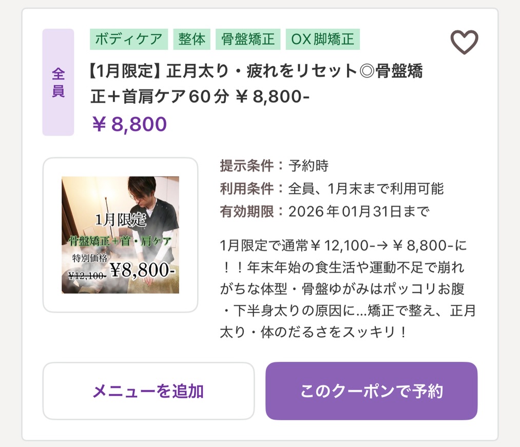 今月は小顔と骨盤矯正の2種類の新クーポンを作っております!
